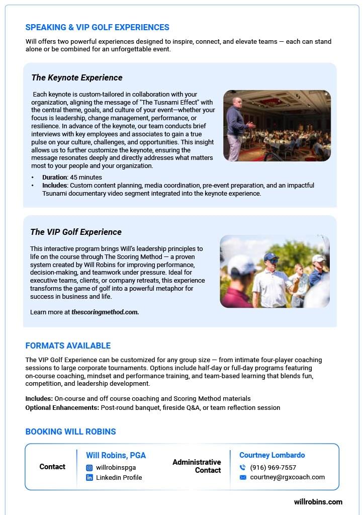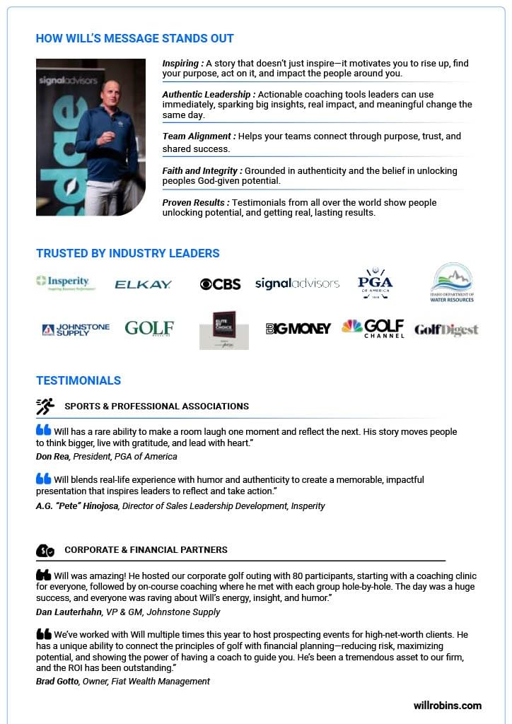 Will’s story will inspire employees, clients and teams to overcome seemingly impossible objections and challenges, and come out as better people. Golfers and professionals continue to use Will’s principles in their life and business environment to achieve a healthy and positive direction.