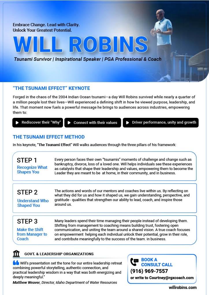 Aspiring golf professional Will Robins was honeymooning on Ko Phi Phi Don Island in Thailand when he and his wife were swept out to sea by a tsunami caused by the 2004 Sumatra earthquake. Due to injuries sustained, Will was forced to give up his competitive golf career and sponsorships. Since the horrific tragedy, Will continues to dedicate his life to those who did not survive the tsunami, and has found peace in teaching the game of golf to others while sharing his amazing story of perseverance, hope and resilience.